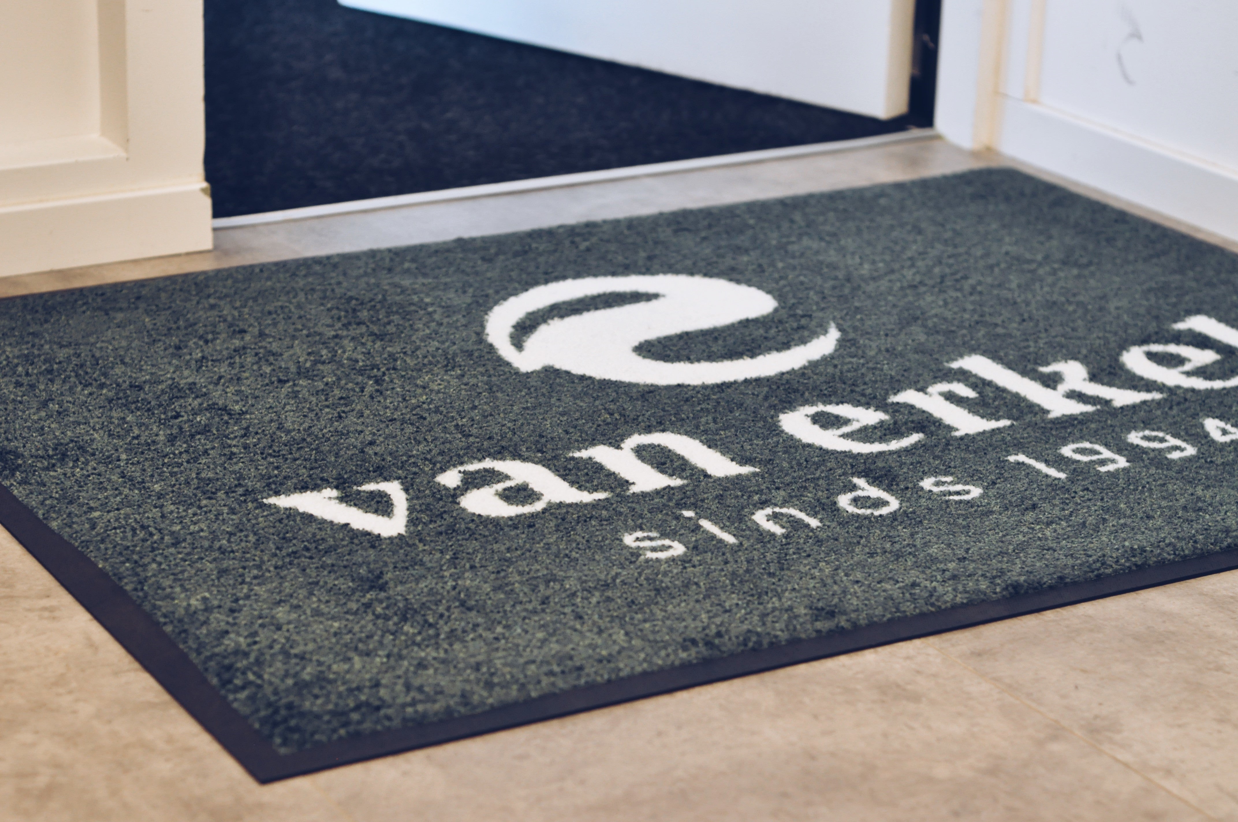 Logomat wasbaar, rubberen backing, verschillende maten leverbaar.