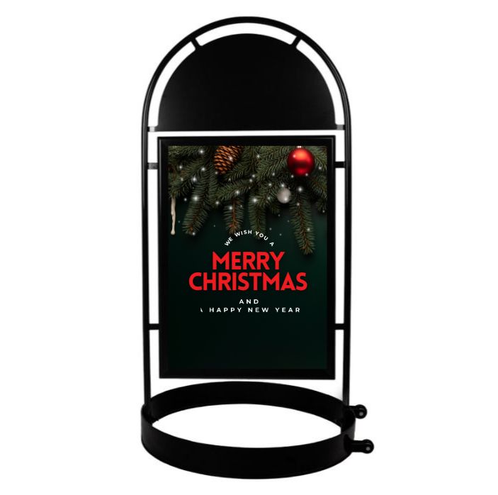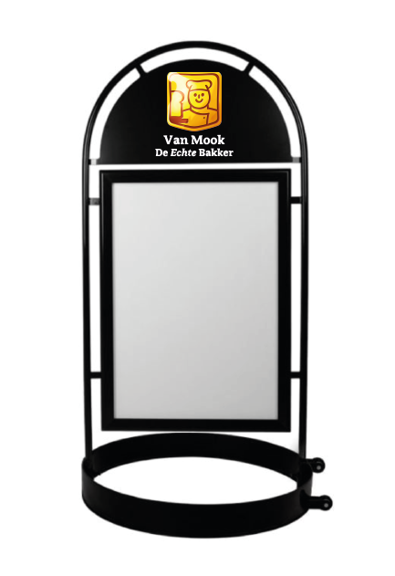 Stoepbord zwart metaal met een open ronde voet, topbord geschikt voor eigen logo of tekst belettering.